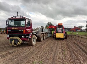 Na een relatief korte maar intensieve maïsoogst konden we de laatste dagen van afgelopen week zo door in de aardappeloogst. Omdat de brug over de sluis van Lemmer naar de NOP afgesloten is moeten producten vanuit Friesland een heel eind verder getransporteerd worden. Een van onze klanten koos daarom voor transport met containerauto’s. Samen met Gebroeders Koster vof uit Biddinghuizen hebben we dit opgepakt. De Ginaf op het land om de containers op de juiste plek te zetten en twee normale vrachtauto’s voor het transport naar Rutten. In vergelijk met een treintje van vijf kippers betekend dit minder wachttijd en minder kosten als er eens een half uurtje oponthoud is. Al met al is het ons en de klant op deze manier prima bevallen.