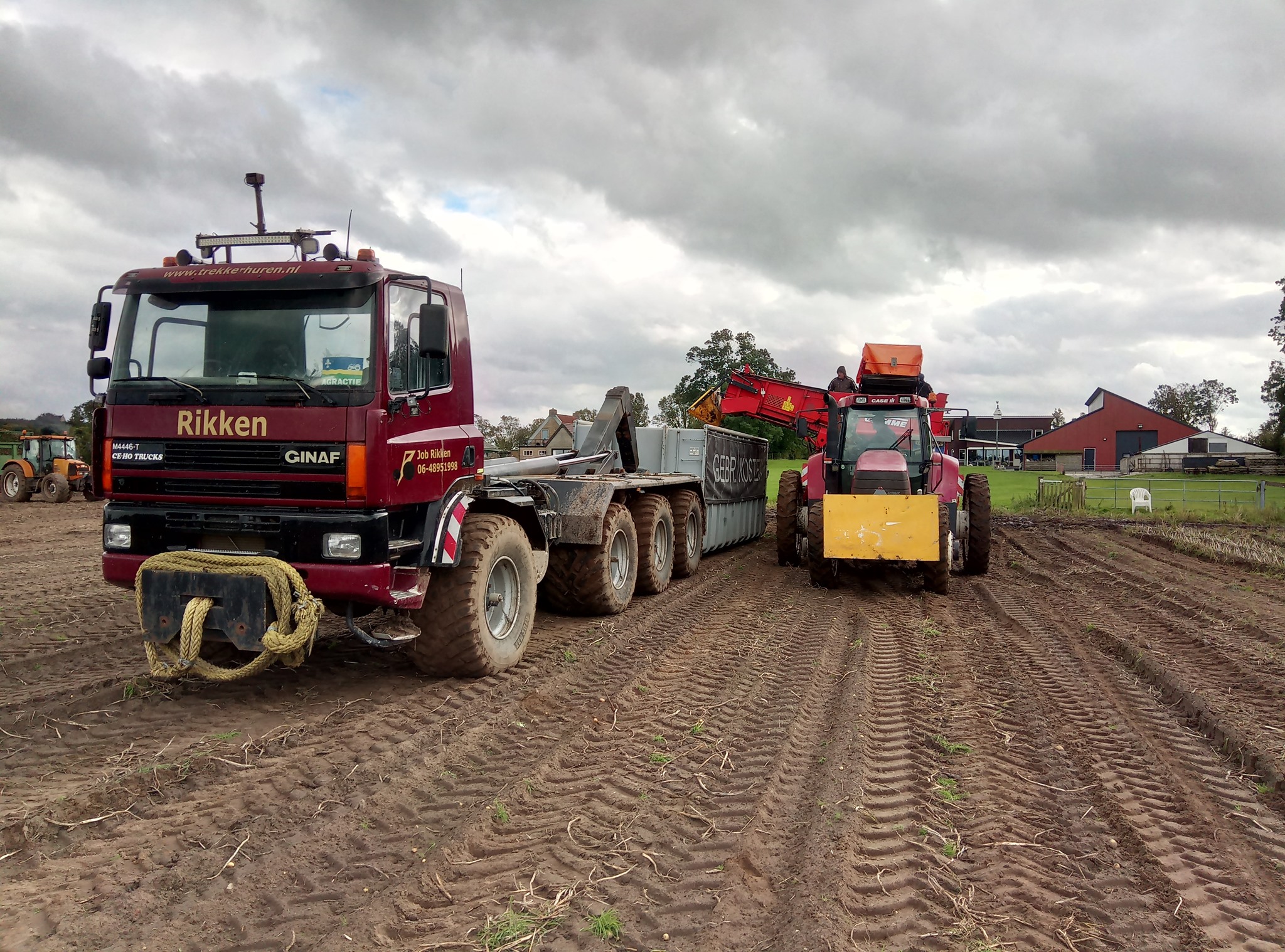 Na een relatief korte maar intensieve maïsoogst konden we de laatste dagen van afgelopen week zo door in de aardappeloogst. Omdat de brug over de sluis van Lemmer naar de NOP afgesloten is moeten producten vanuit Friesland een heel eind verder getransporteerd worden. Een van onze klanten koos daarom voor transport met containerauto’s. Samen met Gebroeders Koster vof uit Biddinghuizen hebben we dit opgepakt. De Ginaf op het land om de containers op de juiste plek te zetten en twee normale vrachtauto’s voor het transport naar Rutten. In vergelijk met een treintje van vijf kippers betekend dit minder wachttijd en minder kosten als er eens een half uurtje oponthoud is. Al met al is het ons en de klant op deze manier prima bevallen.